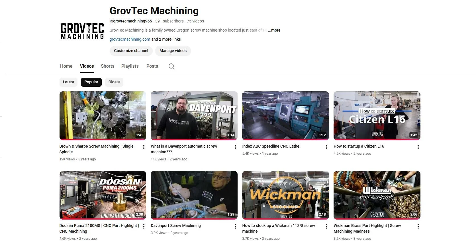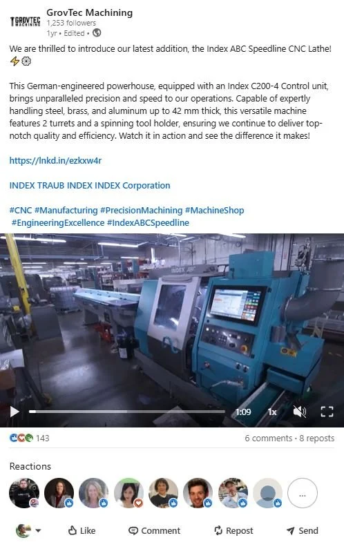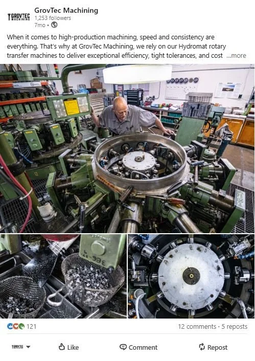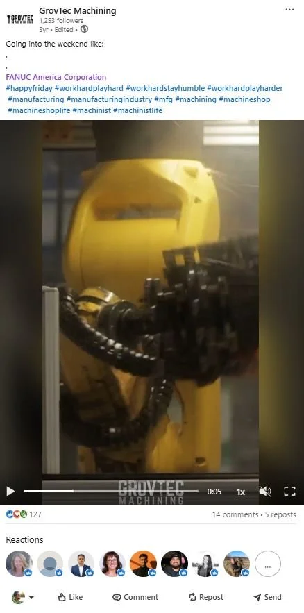 I joined GrovTec Machining in 2021 as an in-house content creator tasked with bringing creativity into a traditional contract machining environment. Over close to five years, I transformed an otherwise lifeless machine shop into a recognizable modern manufacturer by producing original video, photo, and social content that showcased our people, capabilities, and culture. This role shaped me into a high-volume, full-stack content machine, responsible for everything from social strategy and video production to design, branding, and storytelling.